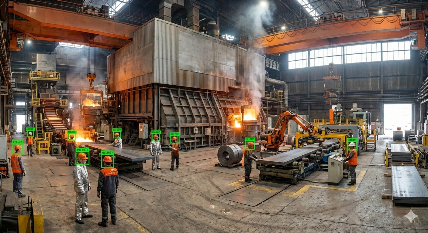 • Detecção de EPI: Bloqueio de acesso ou alerta sonoro se um funcionário entra em área fabril sem capacete ou colete.